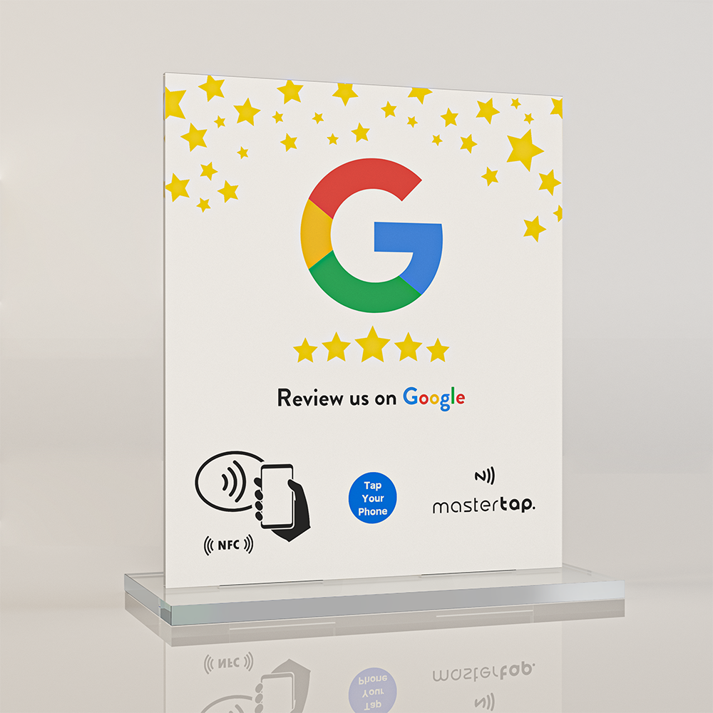 Αναβαθμίστε την online παρουσία και την αξιοπιστία σας με το Google Review Επιτραπέζιο Stand από Plexiglass με NFC της MasterTap σε λευκό χρώμα!